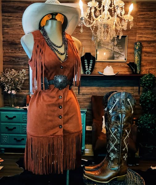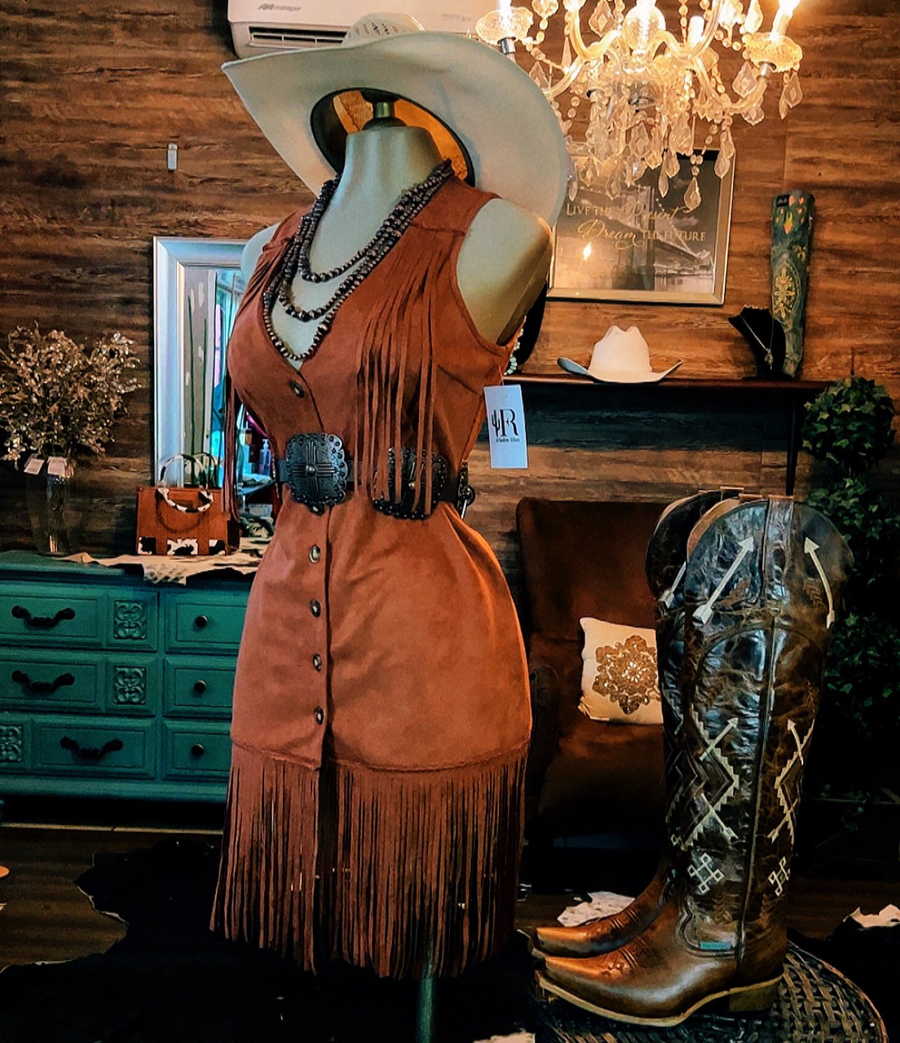 Turn heads with this Fringe Sleeveless Dress, a bold blend of vintage charm and modern Western flair. Designed with button-down detailing, a flattering belted waist, and dramatic fringe hem, this dress is perfect for concerts, festivals, rodeo nights, or a night out in style. Pair it with boots and a statement hat for the ultimate cowgirl-inspired look.