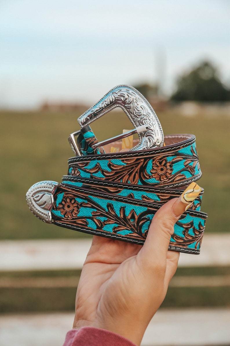 Turquoise adds a pop of pretty color to this leather belt. It has an antique silver-tone buckle which gives it an elegant, old school vibe. The floral pattern etched across the belt lends a delicate look to it.