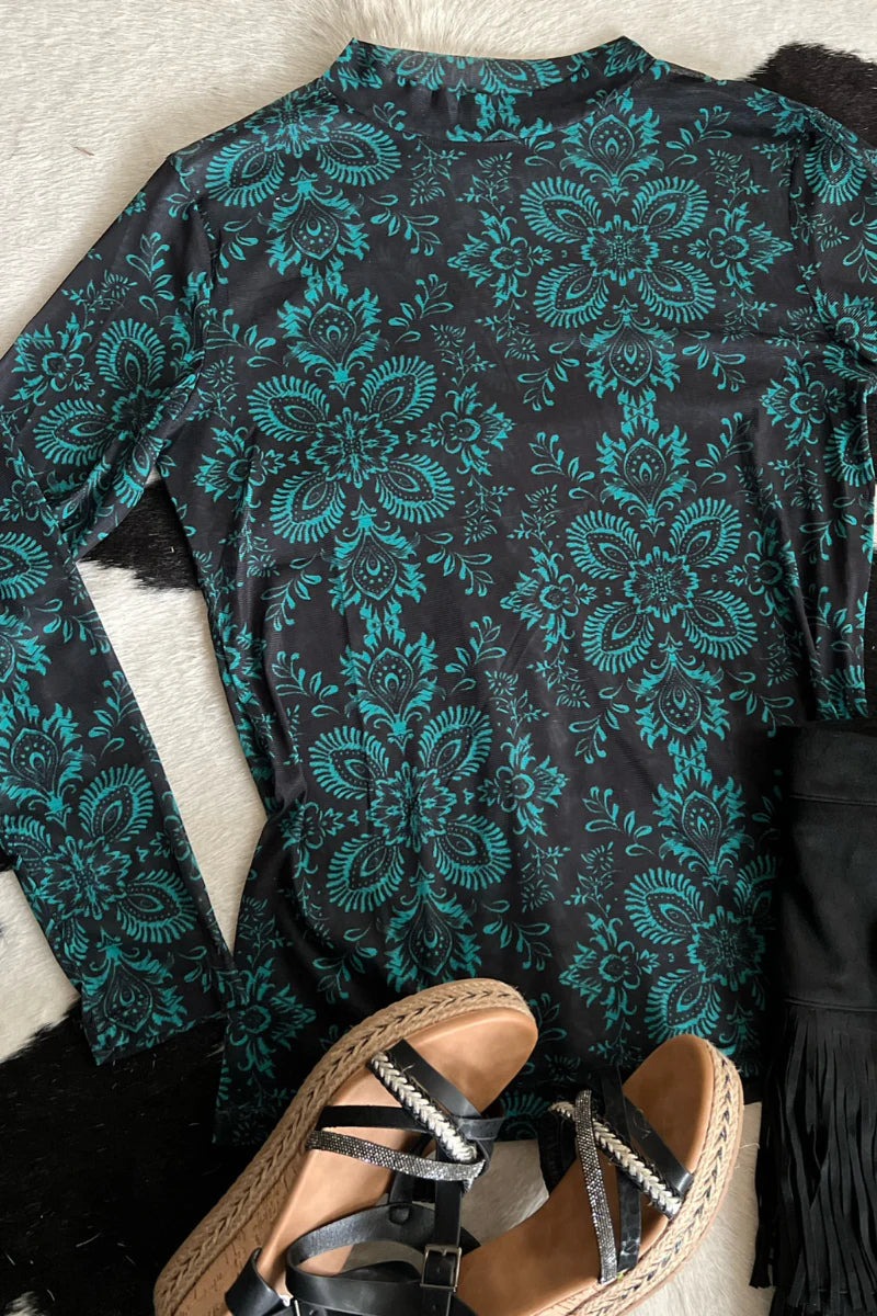 Get ready to stand out in the crowd with our Bring You Closer Mesh Top! This cute top features a unique black and teal pattern that'll make you the center of attention. Not only is it stylish, but it's also incredibly comfy and stretchy. Take your wardrobe to the next level with this must-have mesh top.