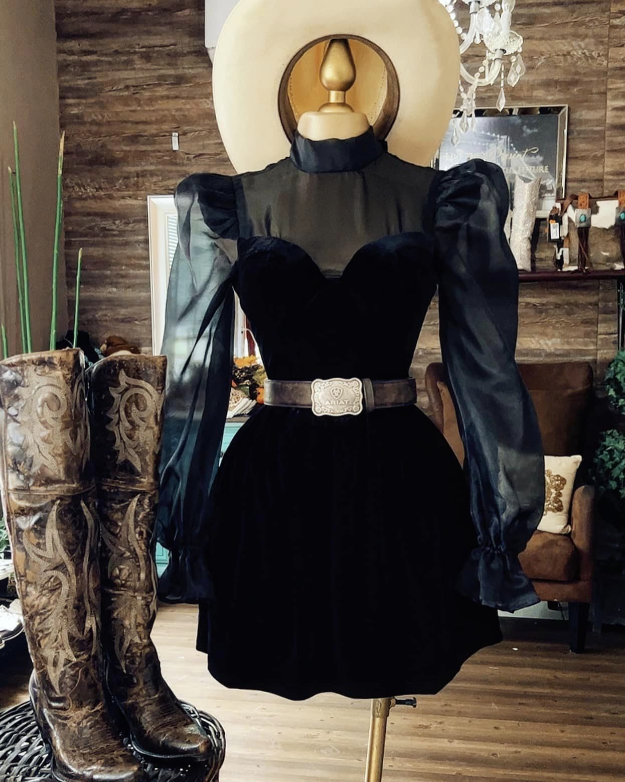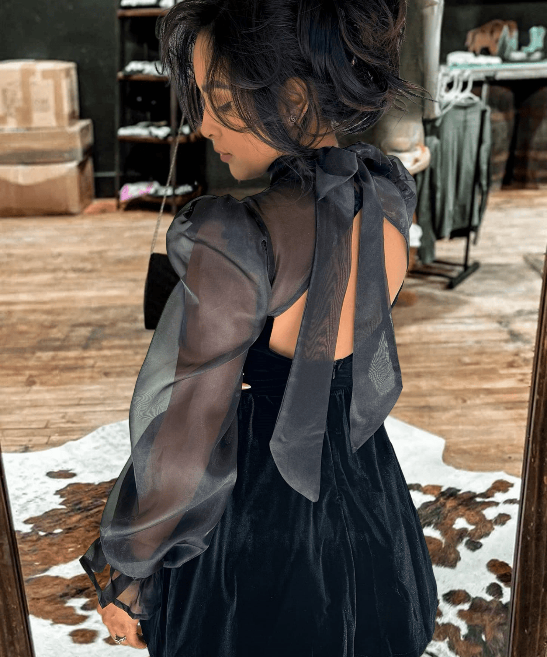 Long puff sleeve organza and velvet contrast sweetheart neckline mini dress with open back