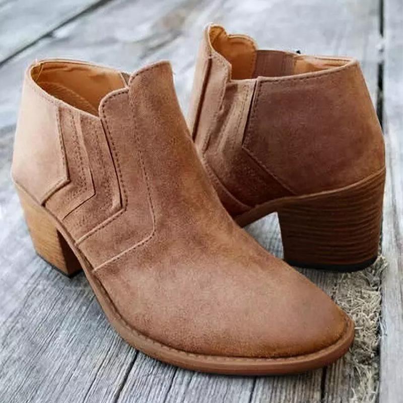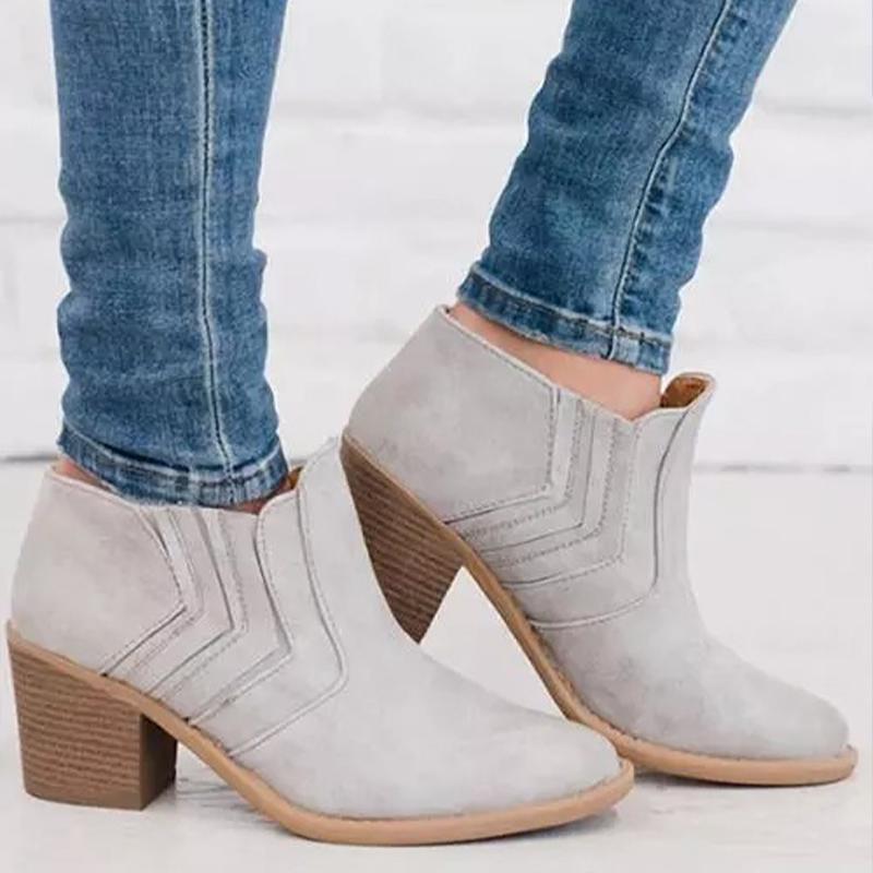 Ladies ankle boots, round toe, chunky low heels,convenient slip on wearing method, carefully selected PU as upper material, solid color brief style for daily outfit.