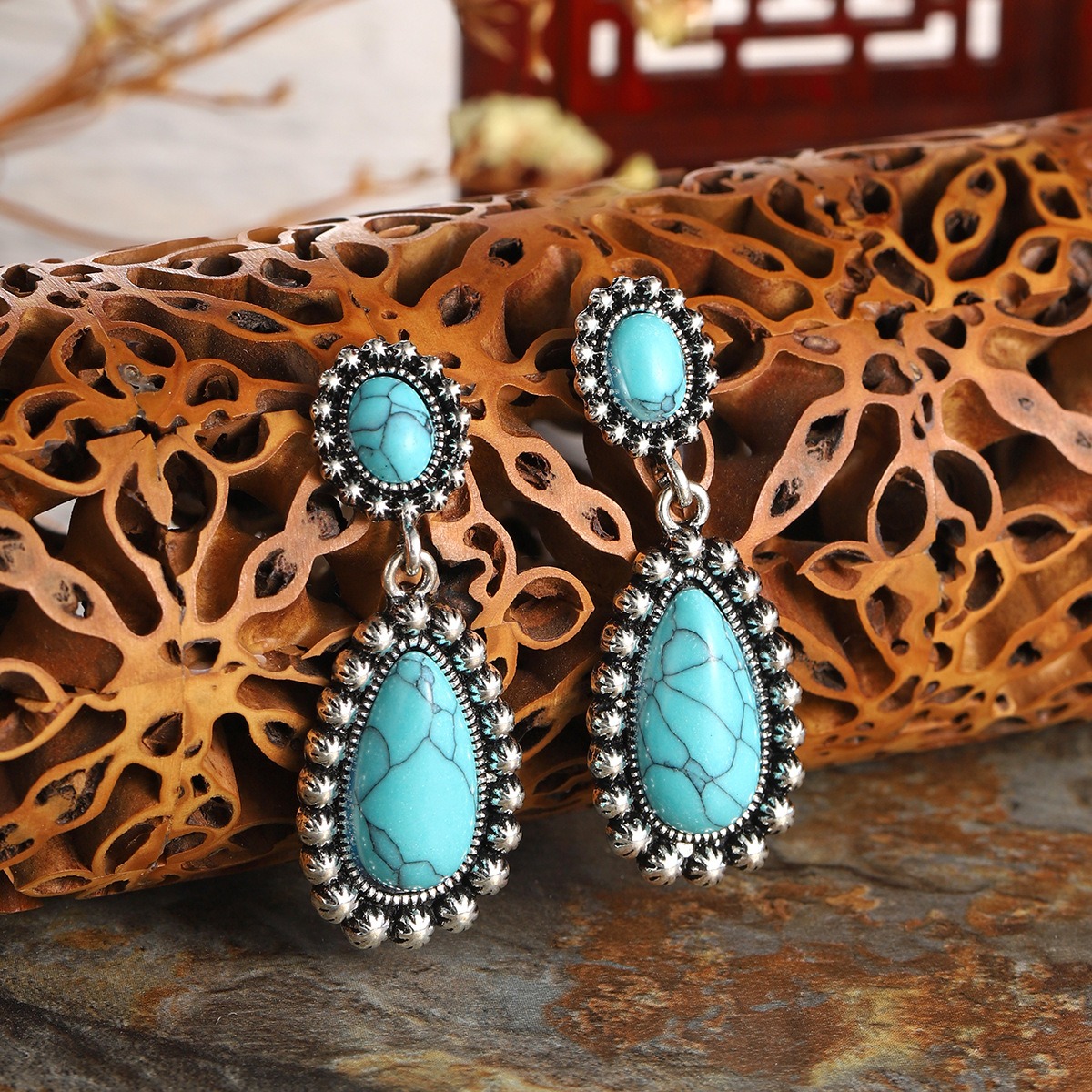 Turquoise Statement Dangle Drop Retro Silver Earrings
