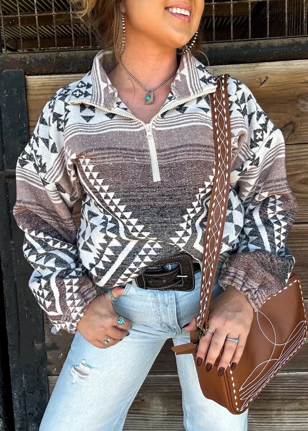 Stay on trend this season in our new retro, round neck sweatshirt. We especially love the abstract print fabric and think this piece will be a new favorite in your closet!